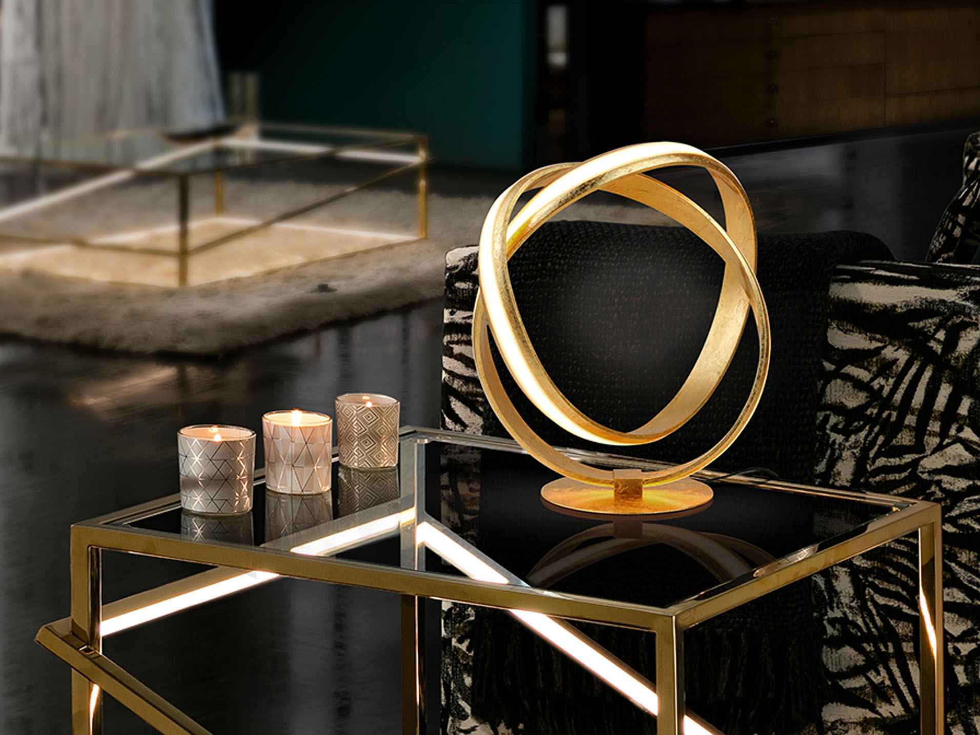 • Lámpara de sobremesa realizada en acero y aluminio, acabado PAN DE ORO.